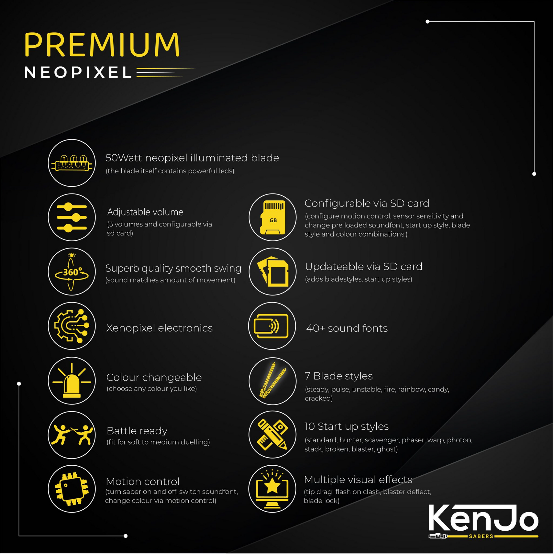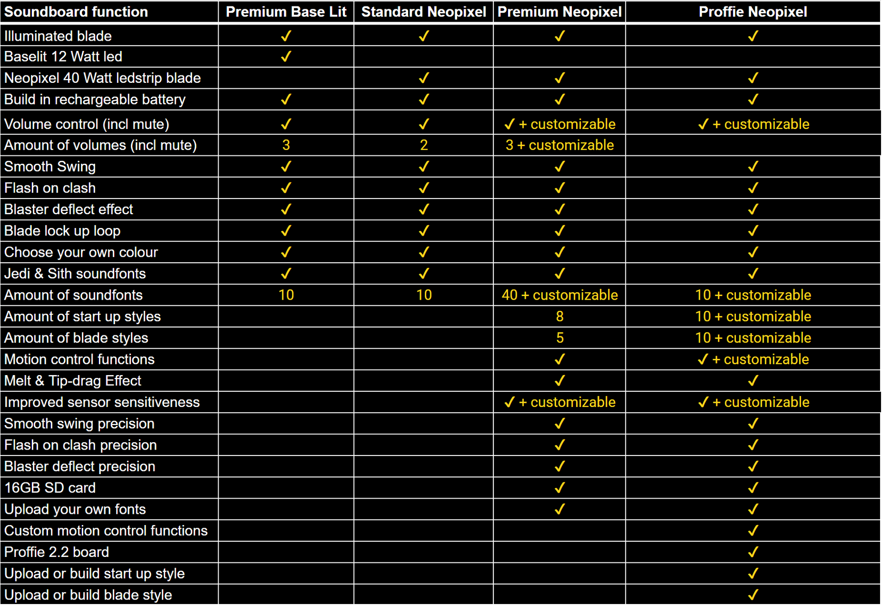 KenJo Sabers are available with different soundboard types. On the product page you can see which soundboards are available for the specific saber.