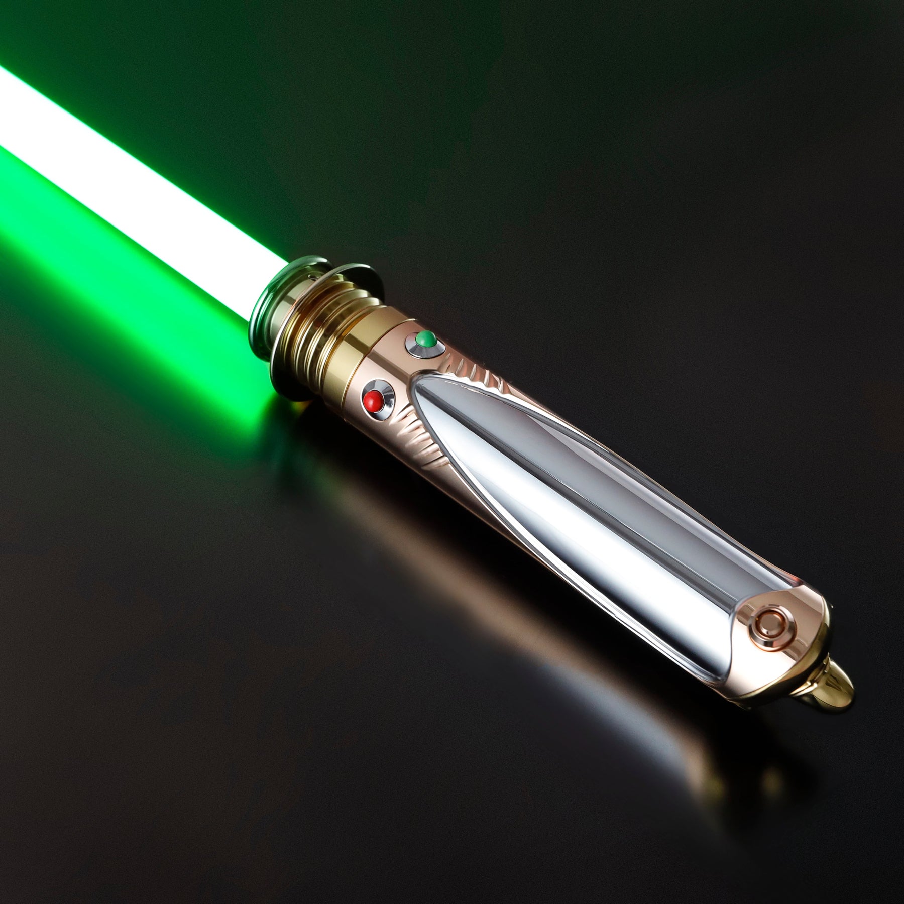 Chancellor is a saber which is clearly different from other sabers. The saber is relatively short which makes it ideal for hiding if you are playing a double game as the owner of this saber did. The hilt is silver and gold which gives the saber a high-quality look. The gold is slightly raised on the silver which makes the silver look like it has been milled out. The emitter of the saber is all gold and has two additional plating. At the bottom is the control knob and a pointed finish. The size of this saber makes it very manageable.