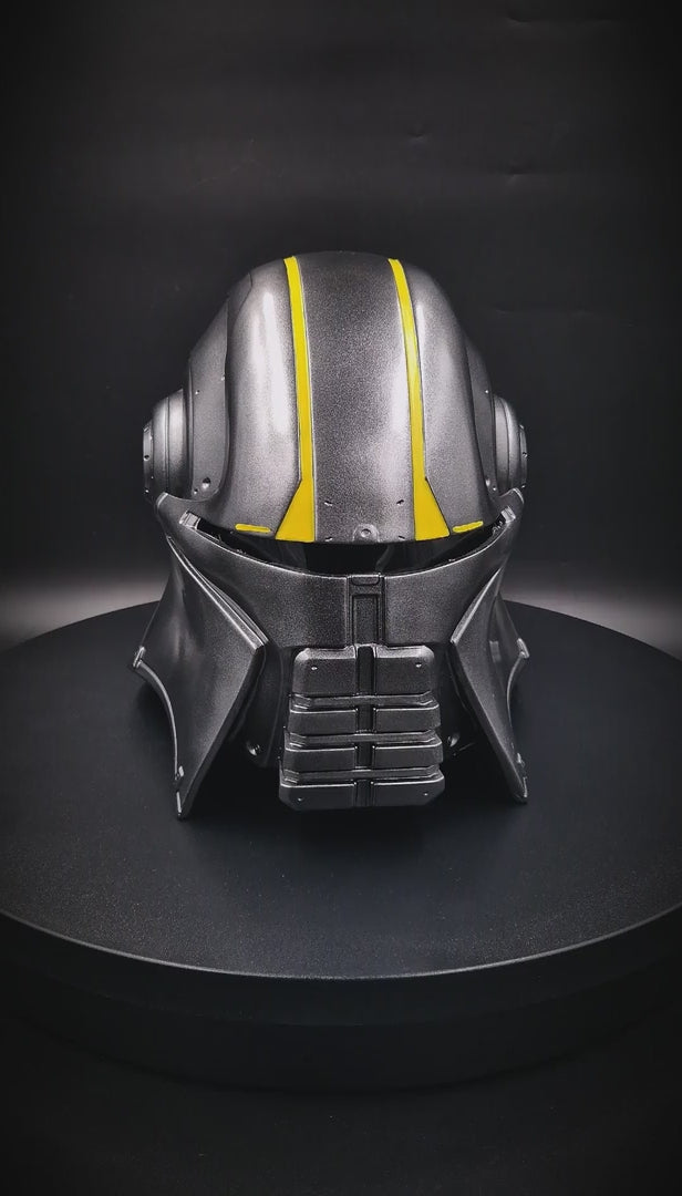 The helmet is made of sturdy resin with a metallic finish, featuring sharp lines, accented details and recognizable yellow striping on the visor. The design is sleek, aggressive and made to impress - whether you choose to cosplay, display or both.