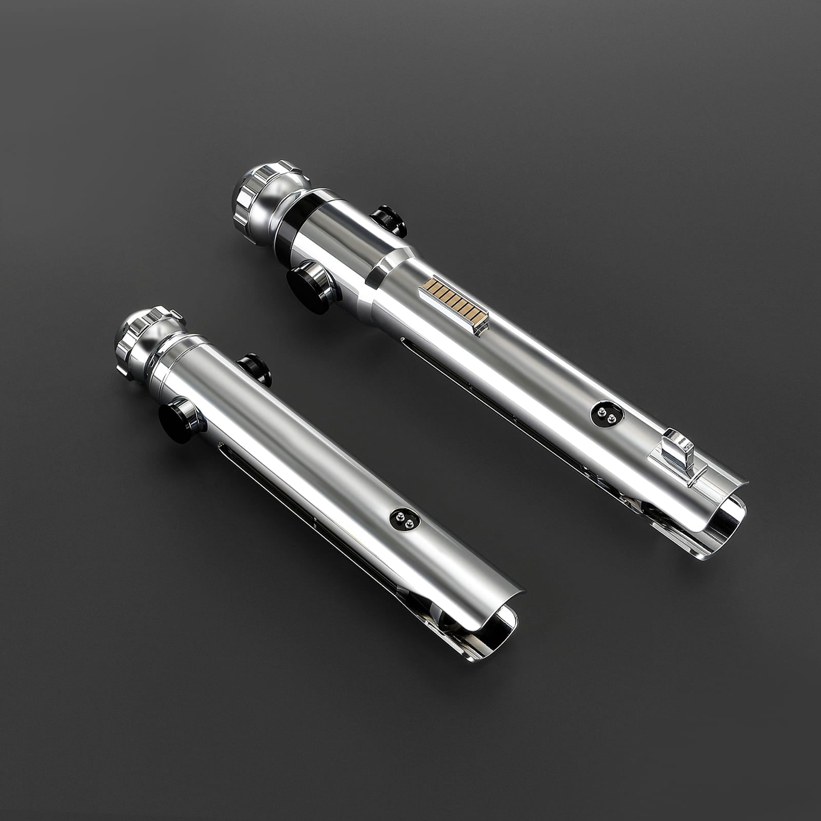 The Daisho, literally translated Long and Short, consists of two hilts. Both hilts are oval in shape and feature an incision that reveals black accents. The sabers themselves are high polished silver and are made of one piece which makes them very strong. On both sabers the mounting screws of the electronics kit are hidden from the front which gives it a sleek look. The small hilt is carried shoto style in the non-dominant hand and therefore also has a shorter sword blade. Also, the charging port is hidden away and the saber is charged through the included battery charger. Furthermore, the end of both sabers is equipped with a belt connector / covertec wheel. This ensures that you can hang the saber on your belt. For this you do need the KenJo Sabers Belt Clip . Practicing and truly dueling with these two sabers requires a high level of skill and is only for the most experienced warrior.