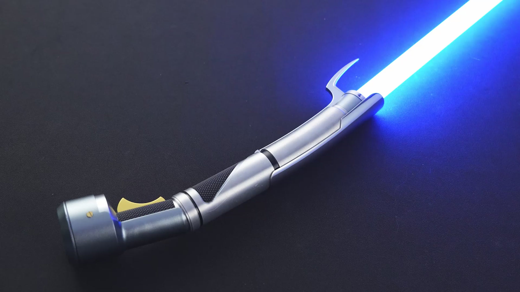 Description: Young Curve is a saber which is clearly different from other sabers. The saber has a curved shape and a hook at the end. The way this saber is shaped there is only one other and that is the sith variant Counts Curve. The hilt is mainly with silver with black details which have a ribbed pattern. This gives the saber a premium and quality look. The charging port is located in the saber itself and the button is integrated into the design which gives this saber a super realistic look.