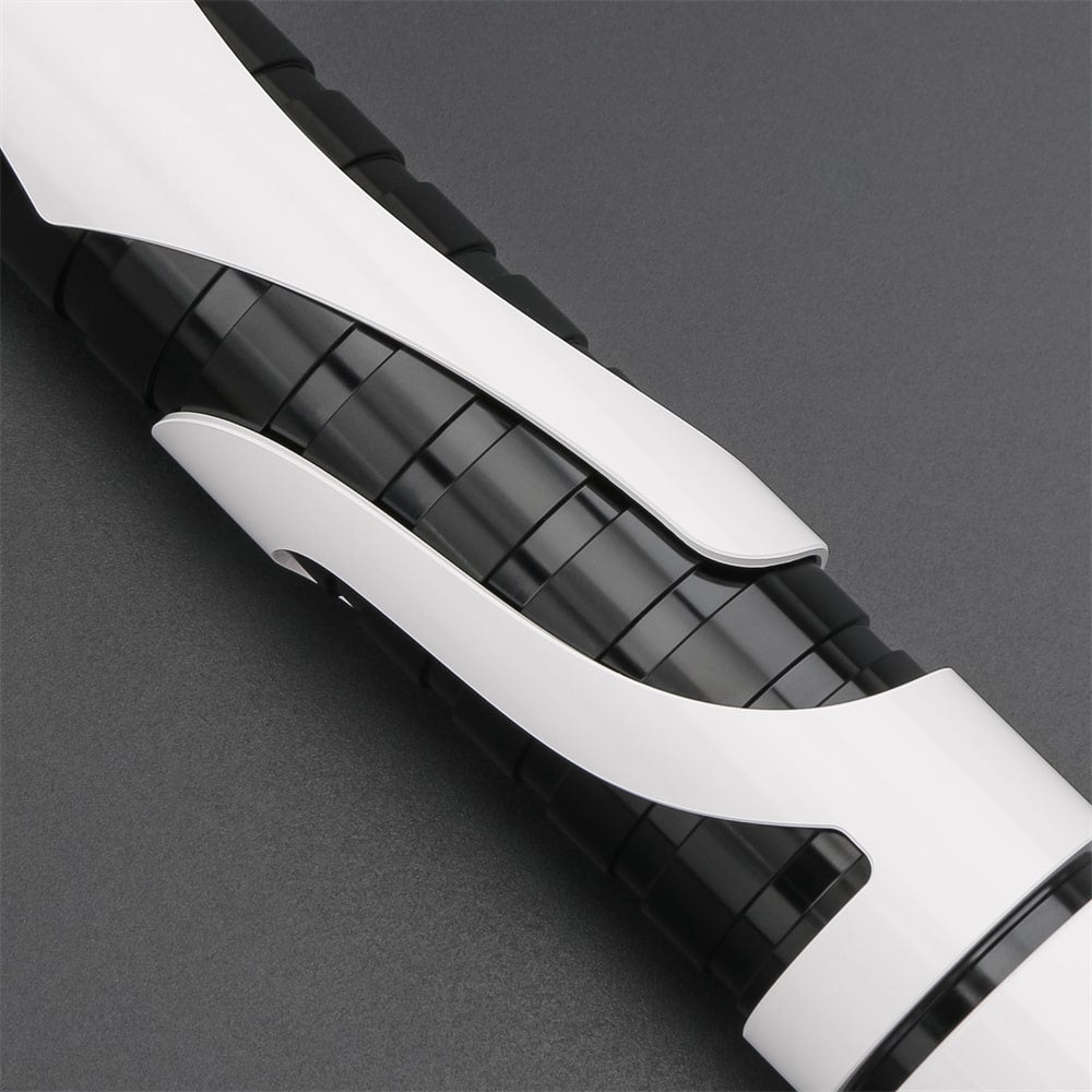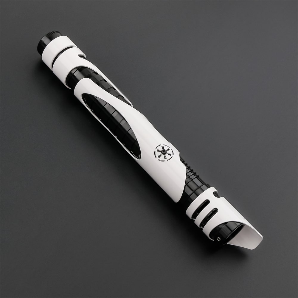 Description: The Kyber Guard immediately stands out for its black and white appearance and visible kyber crystal. The base of this sturdy aluminum saber is all black with thick grooves in the handle. All around, the saber features white plating. The striking luminous kyber crystal is located in an ornate gold-colored holder. Kyber Guard is operated by a button, the charging port is concealed and located on the inside of the saber. This gives the saber a graceful and tough appearance at the same time.