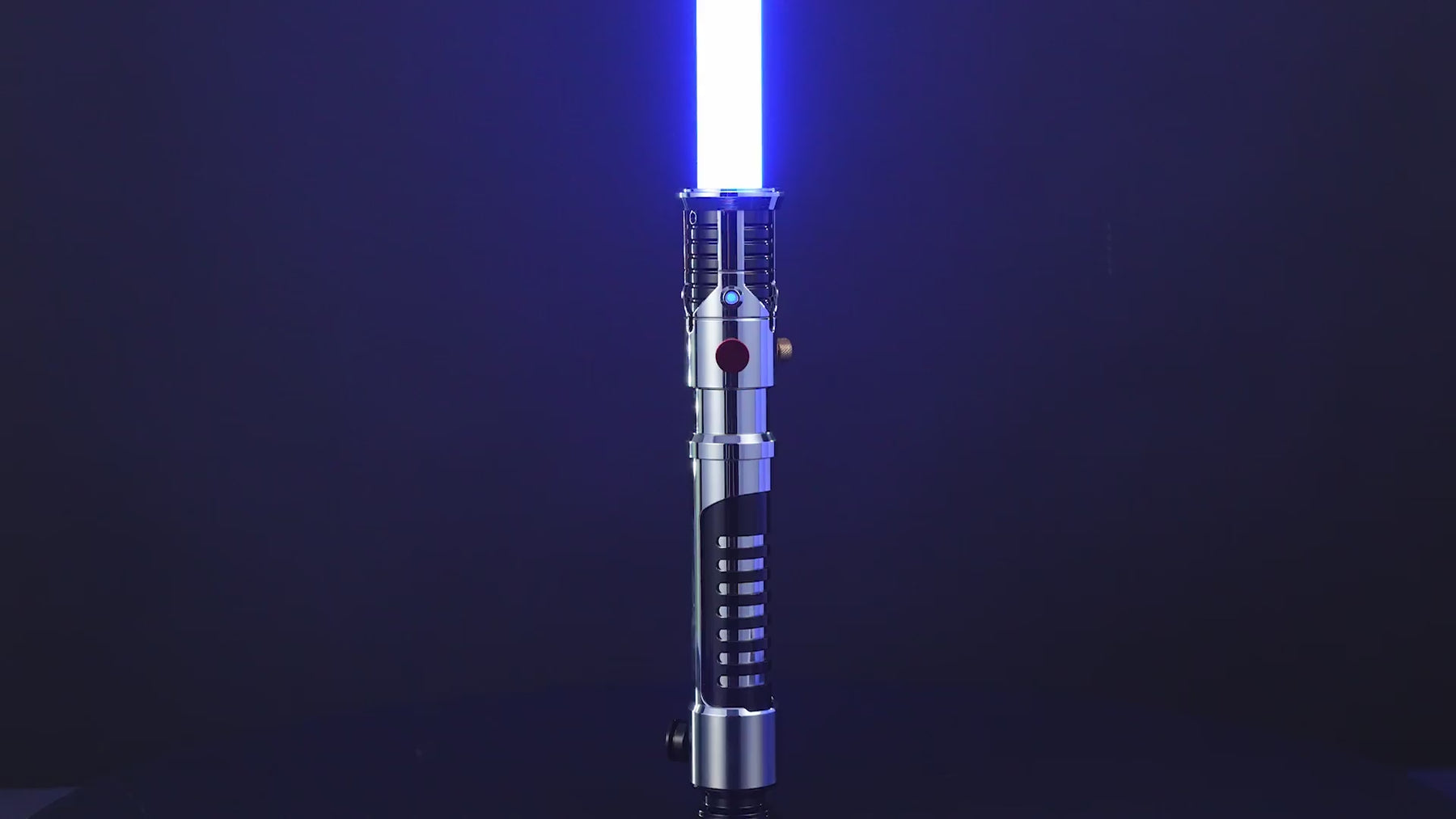 General is a highly detailed and striking saber which is black and silver. The emitter is equipped with various detail buttons which give the saber a realistic look. There are also 4 LEDs around which color along with the blade. The button is gold colored with a luminous core and nicely integrated into the design. The grip features the characteristic black and silver ribbing. This provides a good very firm grip. The bottom of the saber features a black round pommel with silver square blocks. This serves as a counter weight and makes the saber perfectly balanced.