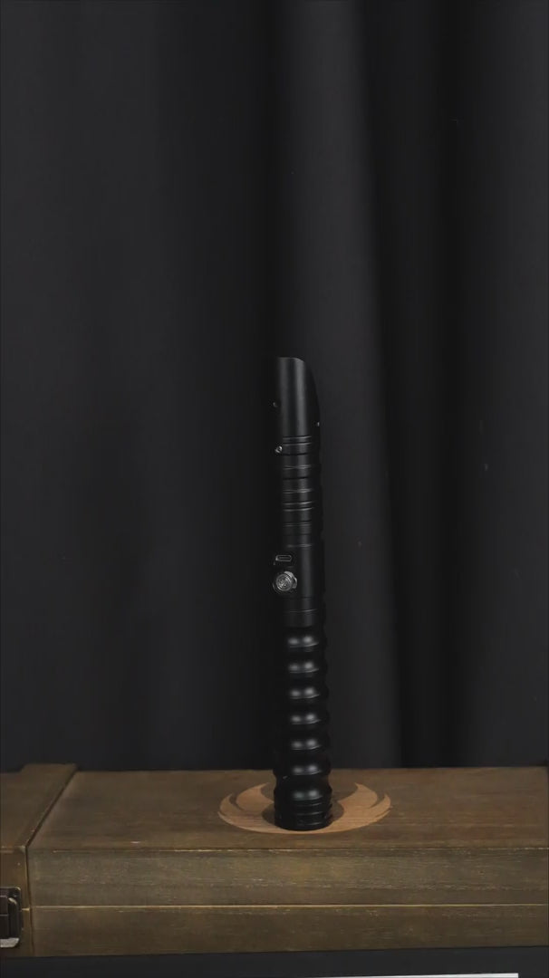 Description: Protege is an all-black saber made from aluminum. This ensures that the handle is lightweight yet very strong. This is perhaps the perfect entry-level saber without compromising on quality. The handle features finger-shaped notches that allow the saber to be held super firmly and will not easily slip out of your hands while dueling or spinning. The emitter is cut at an angle which gives the Protege a fancy finish. At the bottom of the saber is a built-in connector ring. So with a second saber like the Acolyte, for example, you do not need to buy an extra connector ring to make a saberstaff. The flat underside also ensures that the saber can be set up perfectly straight for display in the home.