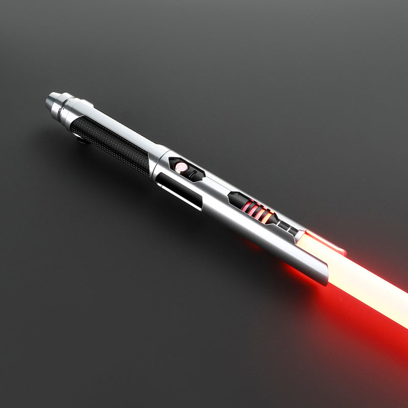 Zero-lyssværdets fæste er lavet af en sort kerne med en blank, let børstet sølvbelægning. Store udskæringer i belægningen blotlægger den sorte kerne med dens fine, firkantede ribbede mønster. Dette giver et godt og behageligt greb. Bagsiden har et indbygget covertech-hjul, der giver dig mulighed for at fastgøre sablen til dit bælte ved hjælp af bælteklipsen. Emitteren har fire store vandrette udskæringer (emittervinduer) på for- og bagsiden, hvilket giver den et karakteristisk udseende. Skift Zero's farve, og emittervinduerne giver den øjeblikkeligt en Sith- eller Jedi-vibe. Belægningen strækker sig over emitteren på begge sider og omgiver effektivt bladet. Dette ser ikke kun cool ud, men reflekterer også lyset klart indefra. Zero har mange detaljer af høj kvalitet, som normalt kun findes i den dyrere Epic-kategori , men til en meget lavere pris. Alt i alt er Zero et super alsidigt sabel af høj kvalitet med mange detaljer til en konkurrencedygtig pris. Vent ikke længere, og oplev Zero selv!