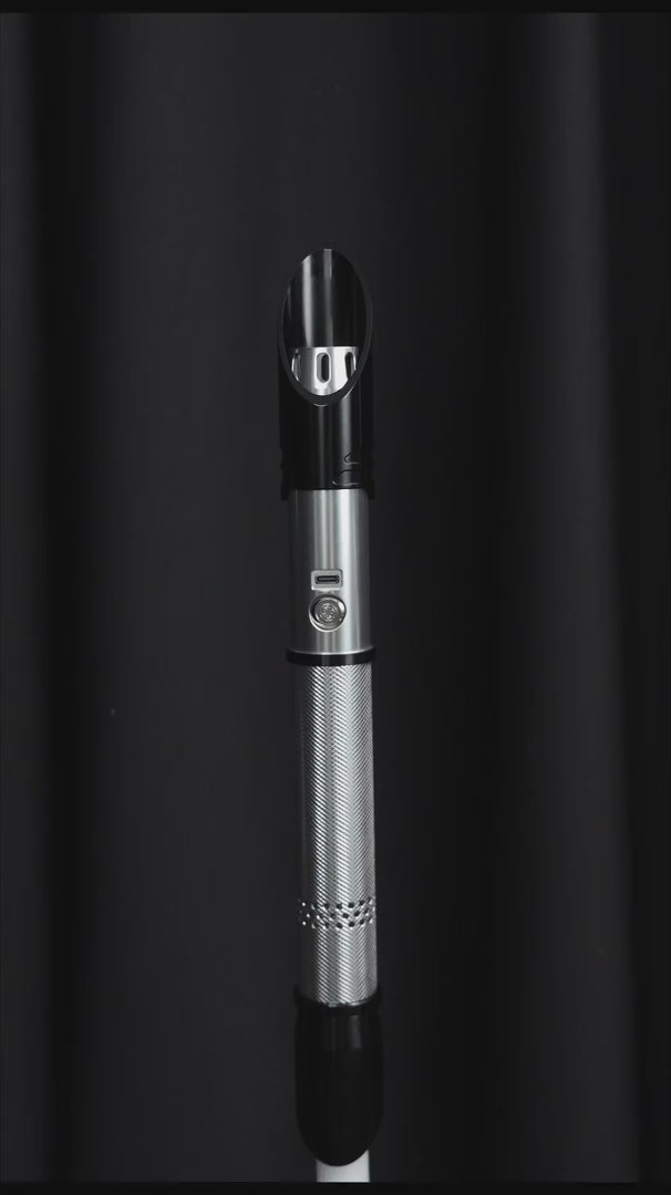 Descrizione: Splitter è una sciabola doppia / sciabola unica nel suo genere. La sciabola è costituita da un'impugnatura con due estremità in cui è possibile inserire una spada e si aziona quindi con un solo pulsante. È anche possibile utilizzare una sola spada invece di due. Lo Splitter ha un aspetto elegante, fondamentalmente argentato con alcuni dettagli neri, come la placcatura obliqua dell'emettitore. Sul lato inferiore del rivestimento dell'emettitore sono presenti alcune aperture che lasciano passare la luce. L'impugnatura presenta un motivo di nervature molto sottile, che conferisce alla sciabola una presa molto confortevole.