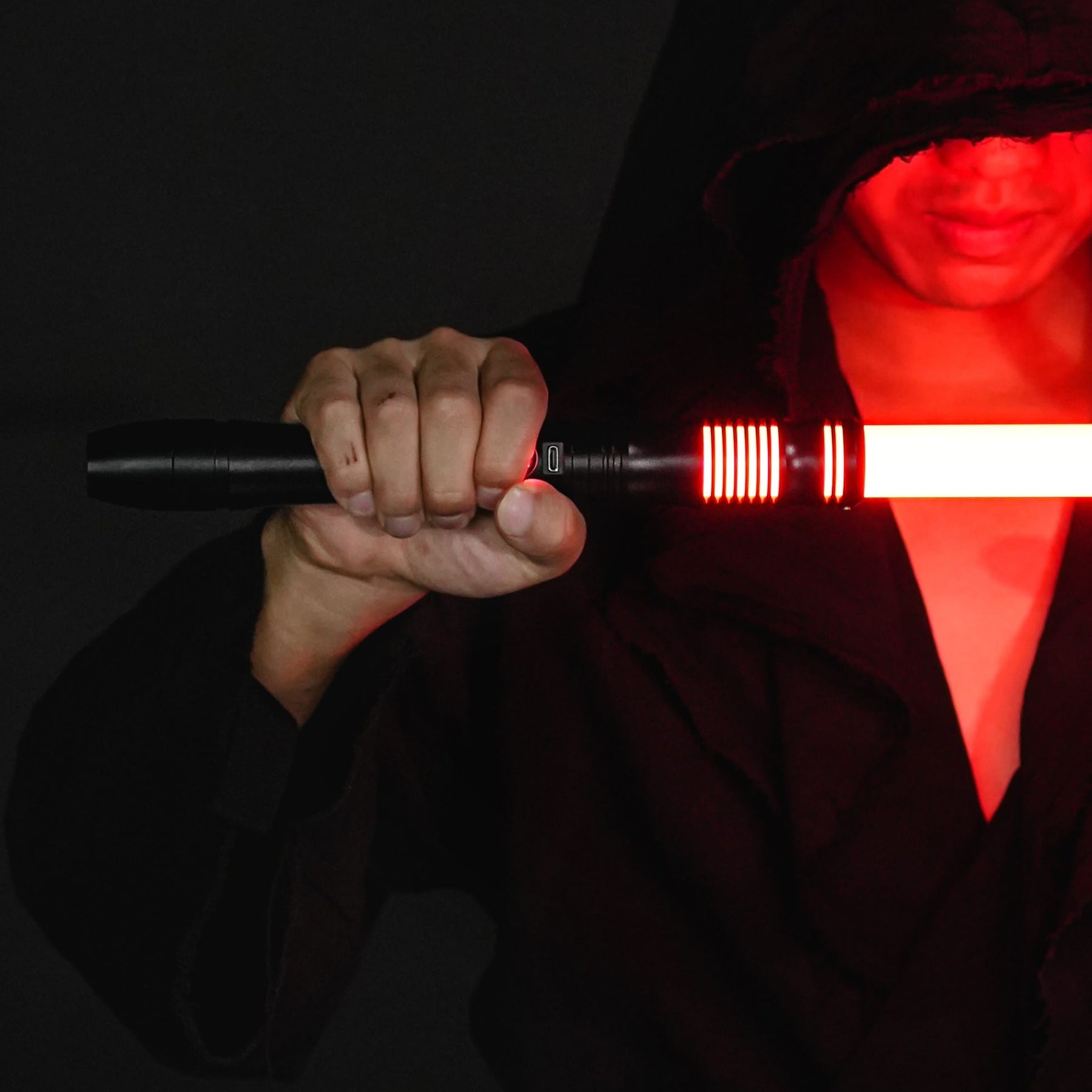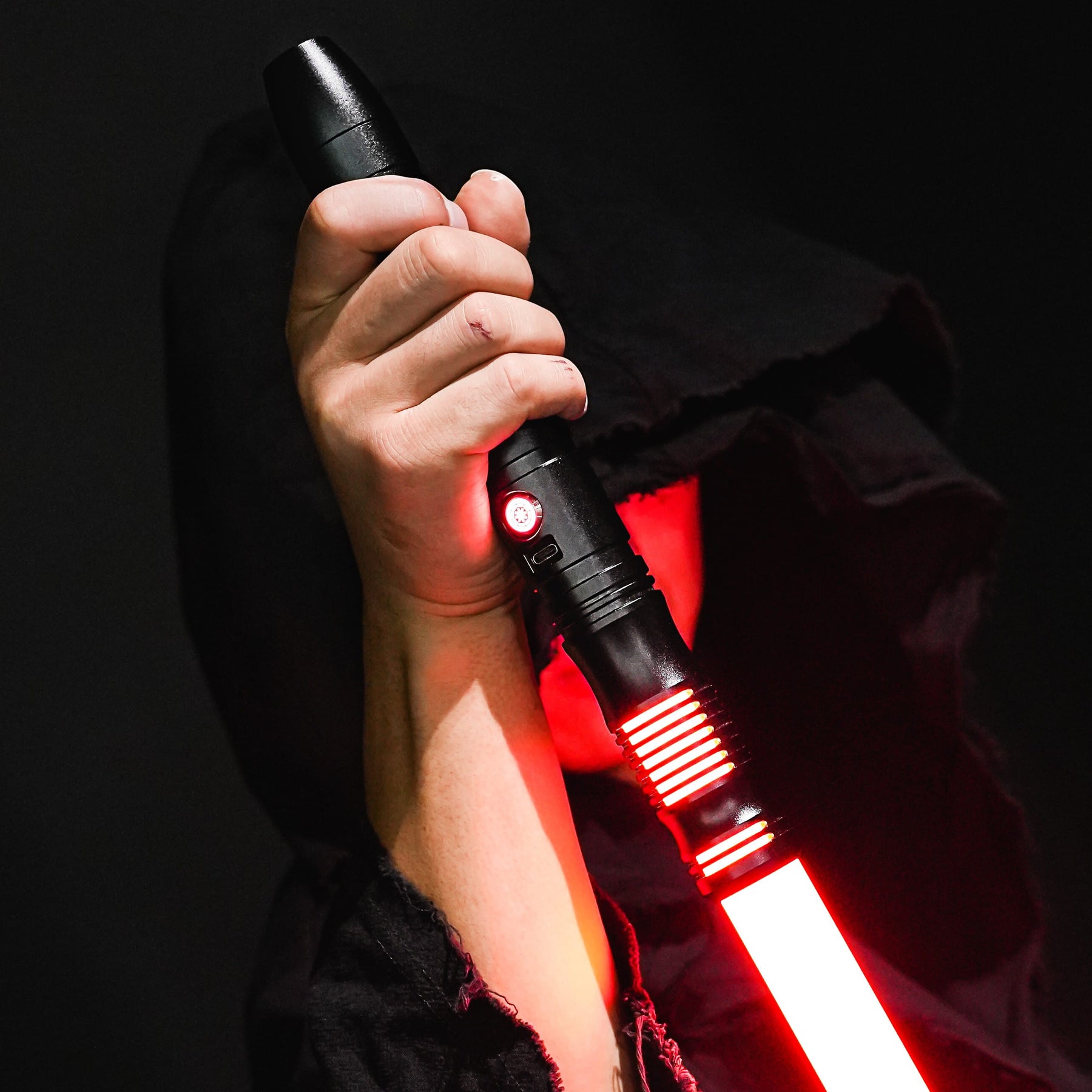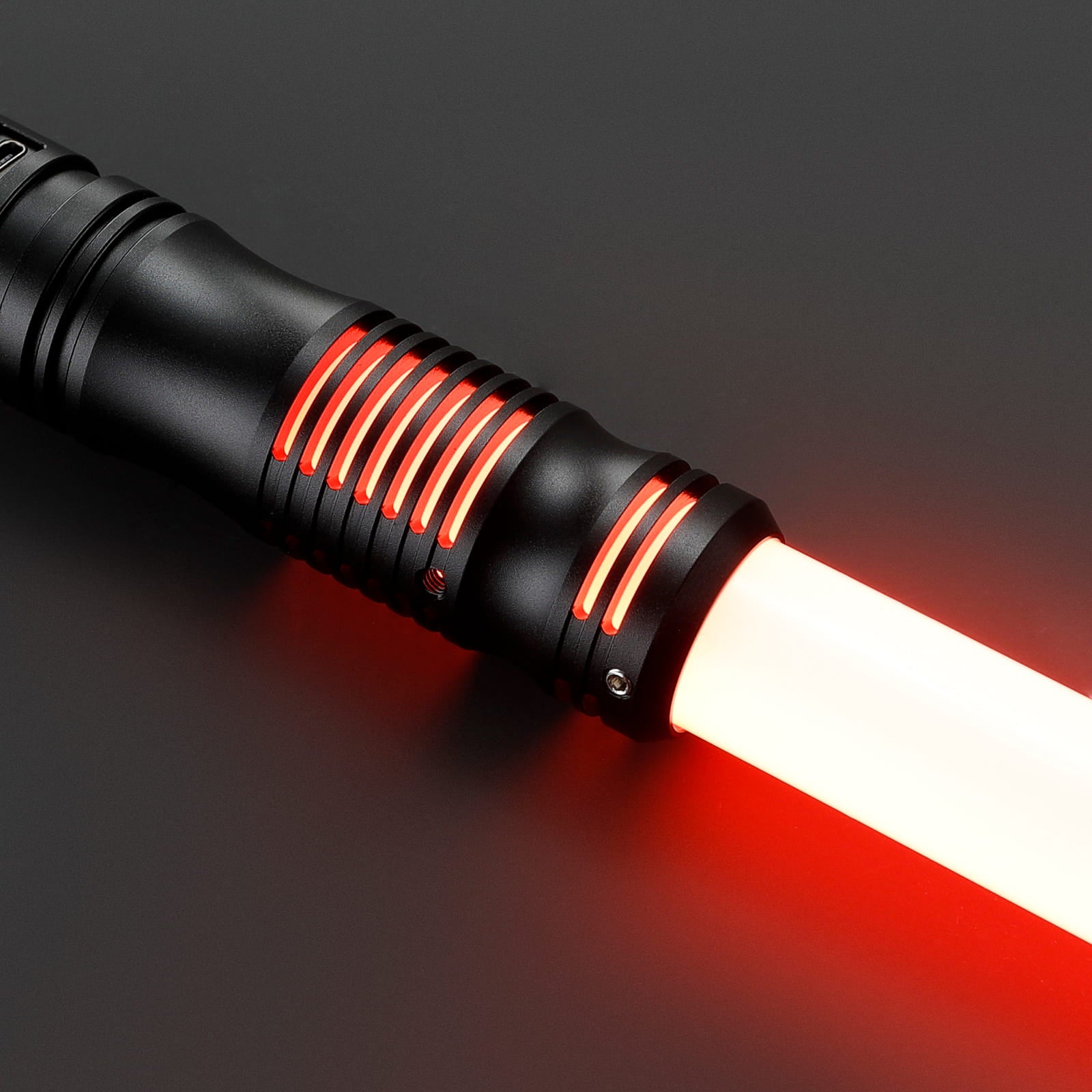 De bovenkant (emitter) van deze saber is het hoogtepunt. Het zwaardblad gaat diep in de saber wat er niet alleen voor zorgt dat deze super sterk is maar geeft daarnaast ook nog extra ruimte voor lichteffecten. De lange horizontale uitsparingen (emitter windows) zorgen namelijk voor een zeer mooi licht effect welke eigenlijk vooral wordt gezien bij duurdere sabers. Bij voor of achter aanzicht lijken de lichtstrepen/uitsnedes te zweven omdat de aansluiting aan de zijkant zit.