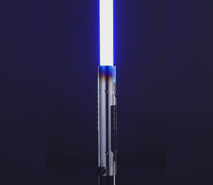 De Xsol lightsaber straalt kracht en elegantie uit. De hilt is voorzien van een stevige 'sleeve' beplating die zich van onder naar boven over de gehele lengte van de hilt uitstrekt, aan beide zijden. Dit ontwerp laat in het midden de kern van de zwarte hilt met horizontale uitfrezingen zien, wat de saber een robuuste en gedetailleerde uitstraling geeft. De emitterplaten steken uit en omringen het zwaardblad, met opvallende blauwe accenten aan de bovenkant die zorgen voor een indrukwekkend heet/warm effect. De subtiele, zwarte bedieningsknop is naadloos geïntegreerd in het design, wat bijdraagt aan de strakke en gestroomlijnde uitstraling. Aan de pommel bevindt zich een D-clip voor eenvoudige bevestiging aan je riem met behulp van de riemclip., het covertech wheel aan de zijkant biedt extra bevestigingsopties. Dit maakt de Xsol niet alleen visueel aantrekkelijk, maar ook praktisch en veelzijdig. Bovendien is het een van de meest betaalbare Legendary sabers op dit moment, ideaal voor zowel verzamelaars als actieve gebruikers.