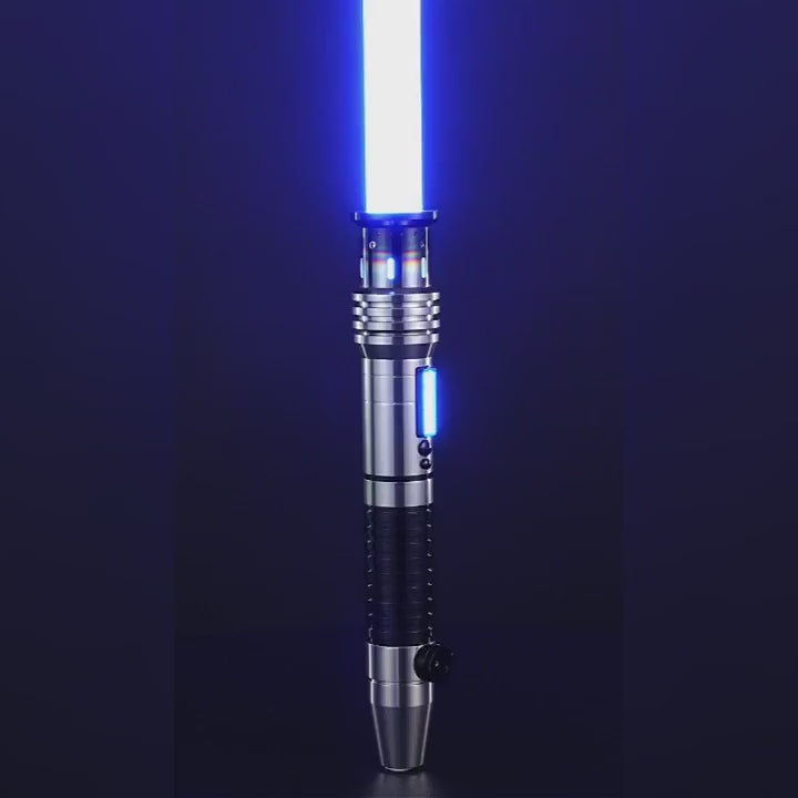 De emitter is kenmerkend door zijn geblakerde afwerking, alsof hij door de hitte van het zwaardblad is gevormd. Dit geeft de saber een realistisch, battle-worn effect dat je direct meeneemt naar de galaxy. In de hilt is een uniek LCD-scherm verwerkt dat de gekozen start-up stijl van de gebruiker volgt. Dit detail voegt een extra dimensie toe en versterkt de beleving op een manier die je zelden bij sabers ziet wat de Torch Bearer een zeer unieke saber maakt. Het handvat is zwart, licht geribbeld en biedt een stevige grip, terwijl de pommel vloeiend afloopt en is voorzien van een handige riemclip-connector, zodat je de saber gemakkelijk aan je outfit kunt dragen. Hiervoor heb je Hiervoor heb je wel de KenJo Sabers Riemclip nodig. Bij elkaar zorgen deze elementen voor een zeer realistische en gedetailleerde saber welke zich duidelijk onderscheid.