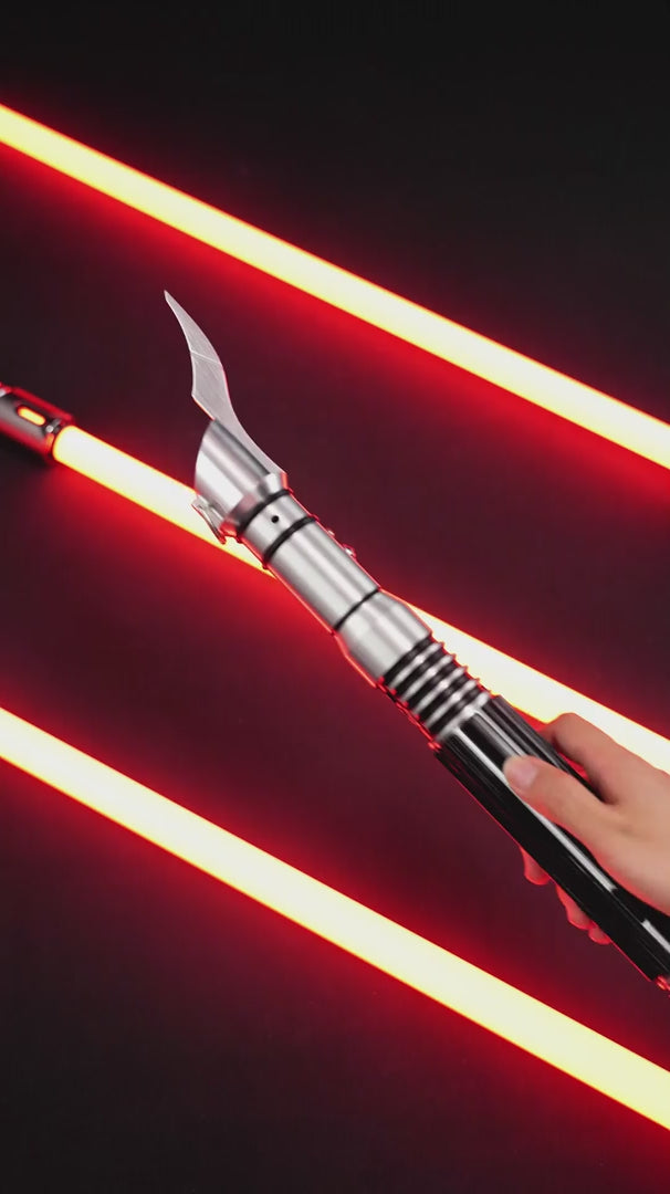 Zabrak Enforcer is a very strong and striking saber. The saber consists of one part, both blades are therefore controlled by one button. The hilt has a sleek matte silver appearance with black details. The grip is plated all around, making it very secure. At the top are additional decorations. From the emitter next to the blades are the iconic protruding points. Zabrak Enforcer is equipped with 2 d-clips to hang it on your cosplay outfit using a belt clip. This saber is great for saber spinning.